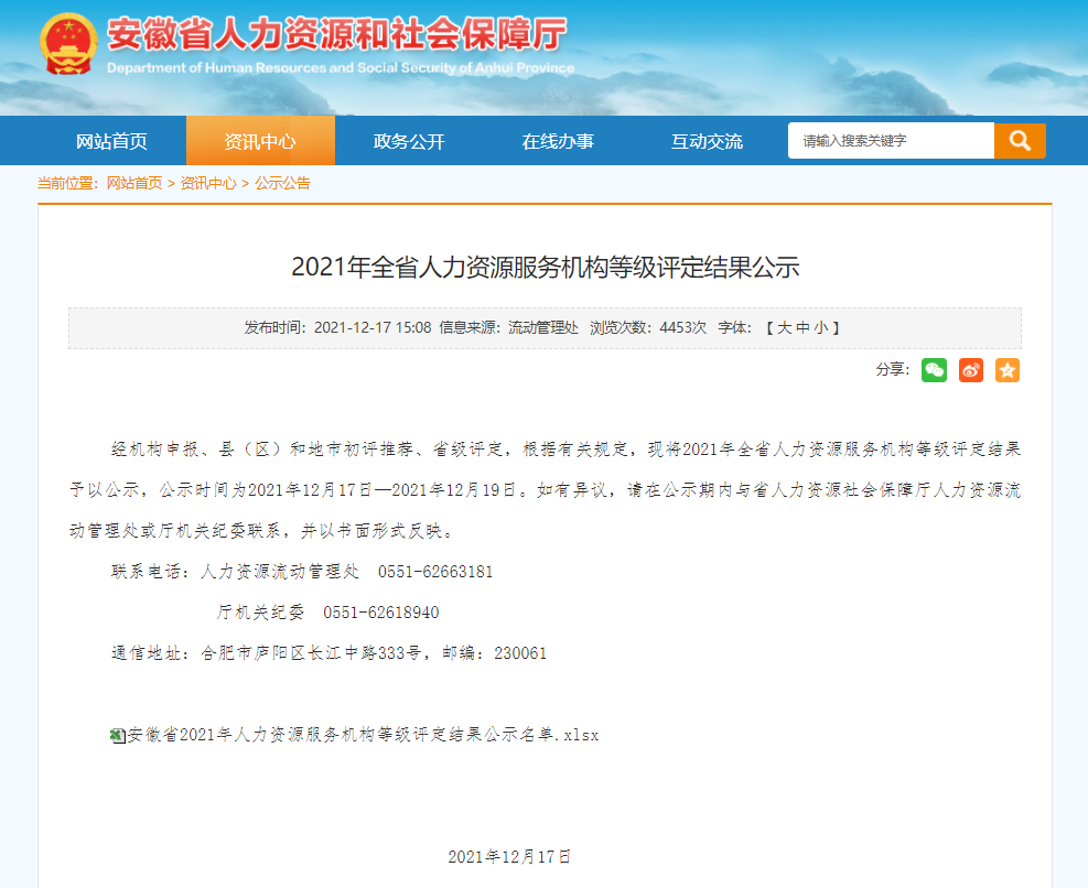 此次人力資源服務(wù)機(jī)構(gòu)等級(jí)評(píng)定是安徽省人力資源服務(wù)地方標(biāo)準(zhǔn)實(shí)施后首次開(kāi)展的一項(xiàng)十分重要的工作,事關(guān)人力資源服務(wù)機(jī)構(gòu)自身建設(shè),事關(guān)人力資源服務(wù)行業(yè)整體發(fā)展。在歷經(jīng)機(jī)構(gòu)申報(bào)、縣(區(qū))和地市初評(píng)推薦、省級(jí)評(píng)定工作后,2021年12月17日安徽省人力資源和社會(huì)保障廳發(fā)布的《2021年全省人力資源服務(wù)機(jī)構(gòu)等級(jí)評(píng)定結(jié)果公示》中,安徽皖信人力資源管理有限公司銅陵分公司榮獲“A”級(jí)人力資源服務(wù)機(jī)構(gòu)榮譽(yù)稱號(hào)。(公示如下圖)