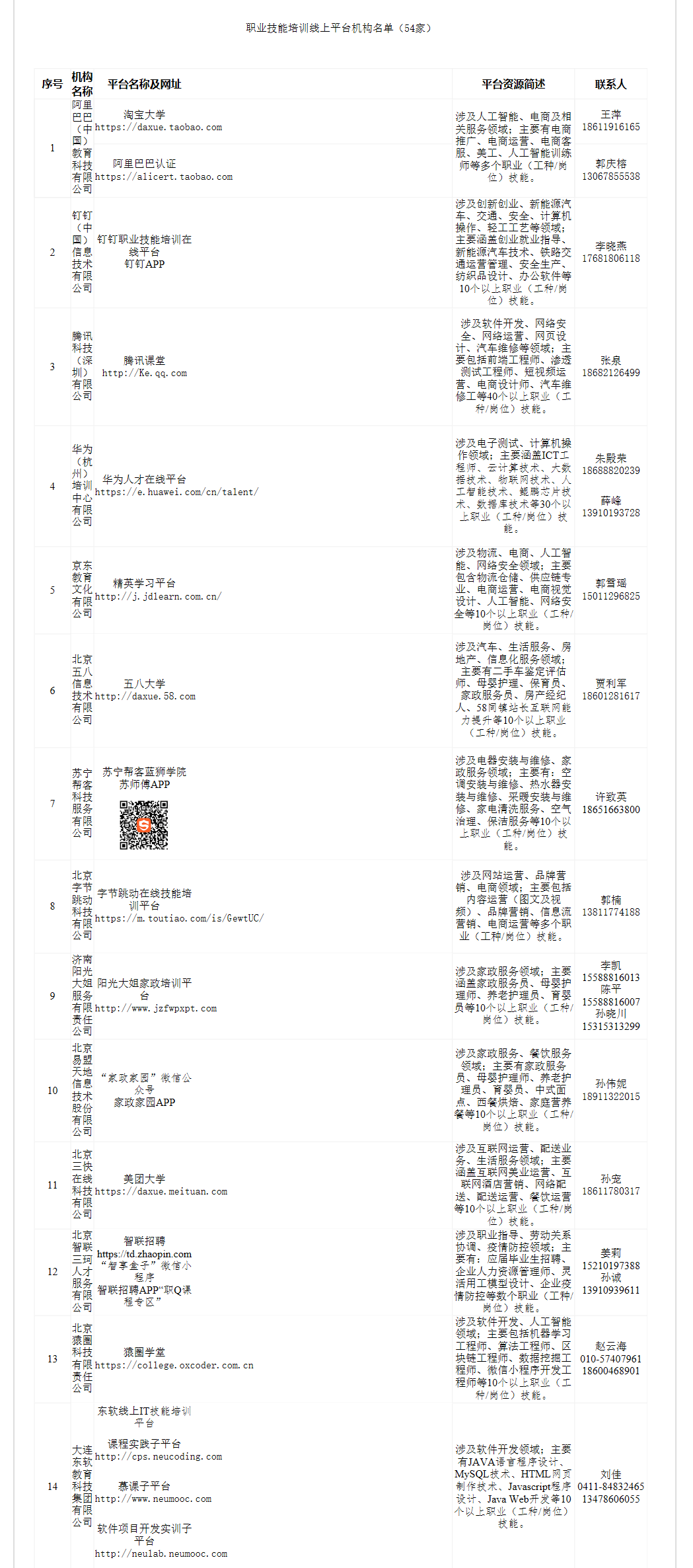 為貫徹落實黨中央、國務院決策部署,深入實施職業(yè)技能提升行動“互聯(lián)網+職業(yè)技能培訓計劃”,人力資源社會保障部近日推薦54家線上平臺機構,在新冠肺炎疫情防控工作期間免費提供線上職業(yè)技能培訓資源及服務。 | 來源:國家人社部官網 人社部