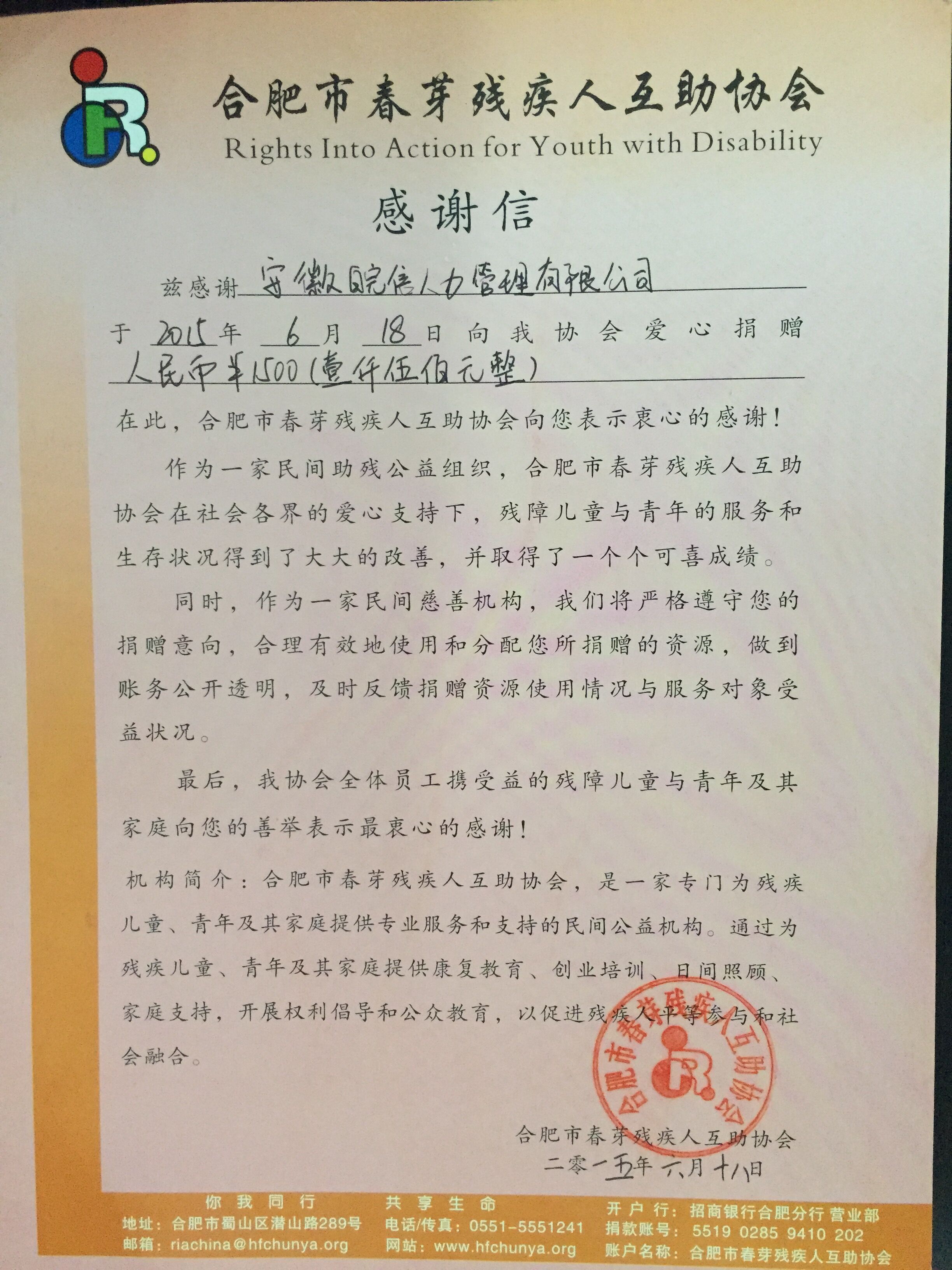 有這么一群孩子,他們有明亮的雙眼,卻拒絕和人對(duì)視;他們有正常的聽力,卻對(duì)親人的呼喚充耳不聞;他們能正常發(fā)聲,卻不與他人交流;他們或許被社會(huì)稱為智障,卻會(huì)在部分領(lǐng)域能力超常,他們就是自閉癥兒童。他們?cè)谏鐣?huì)上被稱為“來自星星的孩子”,為了給這些折翼的天使、無助的家庭一點(diǎn)理解、一點(diǎn)尊重、一點(diǎn)幫助,我司于2015年6月18日向合肥市春芽殘疾人互助協(xié)會(huì)捐助善款1500元。