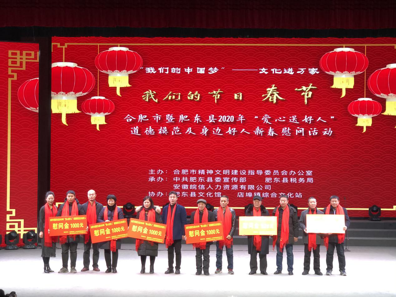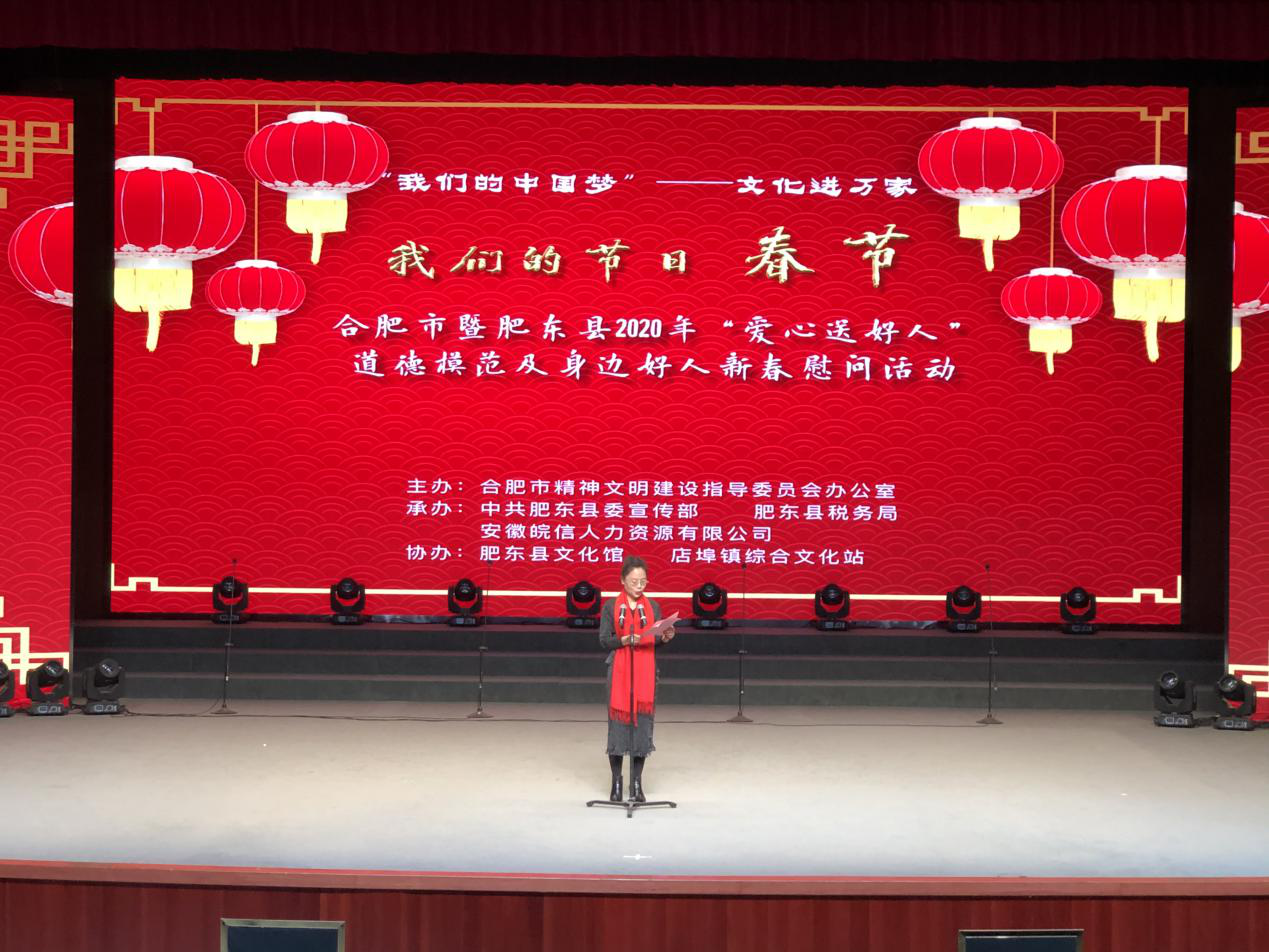 在2020年新春佳節(jié)即將來臨之際,為弘揚優(yōu)秀傳統(tǒng)文化,豐富群眾節(jié)日生活,營造春節(jié)期間濃厚的節(jié)日氛圍,切實加大對道德模范和身邊好人的禮遇幫扶。2020年1月14日,肥東縣文明委聯(lián)合安徽皖信人力資源管理有限公司及肥東縣益邦社會工作發(fā)展中心在丁玉蘭廬劇院隆重舉行“我們的節(jié)日·春節(jié)”——合肥市暨肥東縣“愛心送好人”道德模范及身邊好人新春慰問活動。 參加本次會議的有:肥東縣委常委、宣傳部長許高彬,皖信控股集團(tuán)副總經(jīng)理岳嵐、縣稅務(wù)局副局長王子晟,縣勞模愛心服務(wù)隊元運竹、袁頌等。全縣86名道德模范和身邊好人代表,各鄉(xiāng)鎮(zhèn)、開發(fā)園區(qū)宣傳委員或文明創(chuàng)建分管負(fù)責(zé)人以及縣委宣傳部相關(guān)負(fù)責(zé)人、有關(guān)縣直單位分管負(fù)責(zé)人參加。 其中皖信控股集團(tuán)副總經(jīng)理岳嵐出席發(fā)表講話,表達(dá)了皖信控股集團(tuán)關(guān)注社會公益,積極致力于扶貧幫困各項活動的意愿。 在2020年新春佳節(jié)即將來臨之際,為弘揚優(yōu)秀傳統(tǒng)文化,豐富群眾節(jié)日生活,營造春節(jié)期間濃厚的節(jié)日氛圍,切實加大對道德模范和身邊好人的禮遇幫扶。2020年1月14日,肥東縣文明委聯(lián)合安徽皖信人力資源管理有限公司及肥東縣益邦社會工作發(fā)展中心在丁玉蘭廬劇院隆重舉行“我們的節(jié)日·春節(jié)”——合肥市暨肥東縣“愛心送好人”道德模范及身邊好人新春慰問活動。 本次活動共分兩項進(jìn)行,上半部分為愛心捐贈活動,下半部分為文藝表演。其中皖信控股集團(tuán)帶來《我愛你中國》大合唱表演。 本次“我們的節(jié)日·春節(jié)”——合肥市暨肥東縣“愛心送好人”道德模范及身邊好人新春慰問活動中,皖信控股集團(tuán)為86名道德模范及身邊好人捐助共計86000元。這不單單鞏固了皖信集團(tuán)在肥東縣作為愛心企業(yè)的光輝形象,更是為肥東縣公益事業(yè)作出了強而有力的支持,鼓勵了更多的人民群眾參與做好事、樂于助人的行動中來。