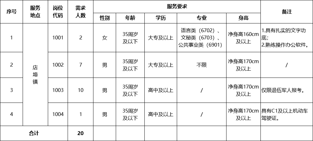 計(jì)劃招聘城市管理輔助項(xiàng)目服務(wù)人員20名,具體要求如下表: