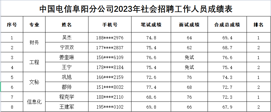 中國電信阜陽分公司2023年社會招聘工作人員總成績公布