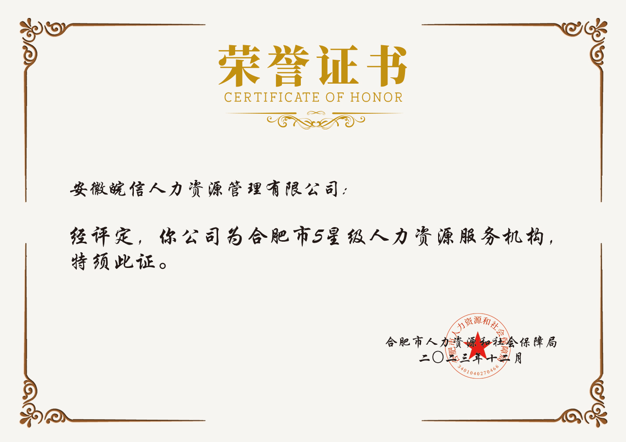 皖信人力再獲“安徽省 AAAAA 級人力資源服務(wù)機(jī)構(gòu)”、“合肥市五星級人力資源服務(wù)機(jī)構(gòu)”等多項(xiàng)榮譽(yù)