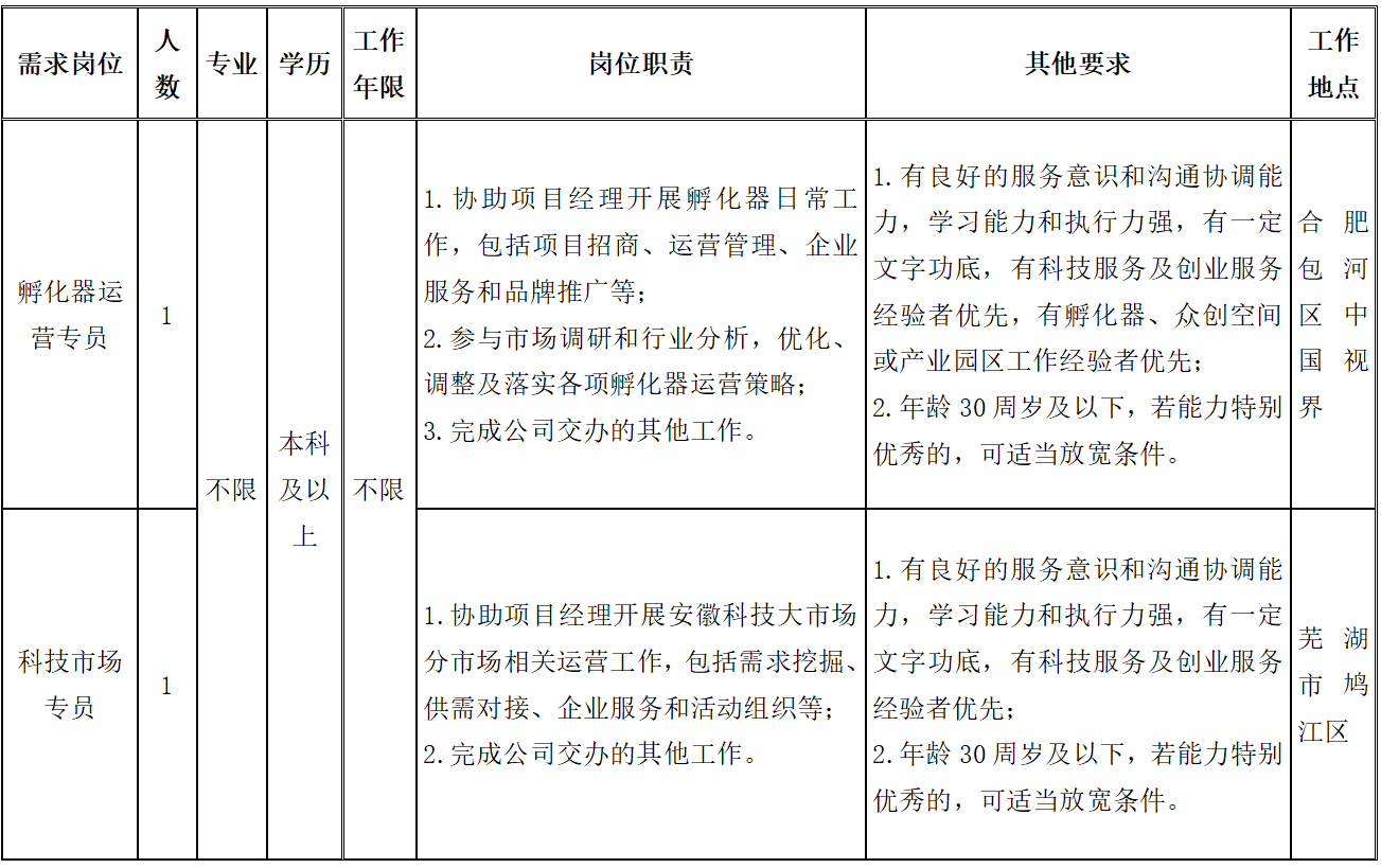 因工作需要,經(jīng)安徽科技大市場(chǎng)建設(shè)運(yùn)營(yíng)有限責(zé)任公司研究決定,委托安徽皖信人力資源管理有限公司招聘2名工作人員。現(xiàn)就有關(guān)事項(xiàng)公告如下: