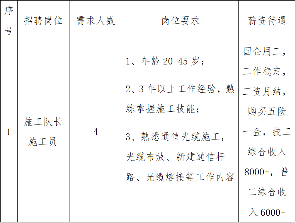 某國企單位(通信行業(yè))2024年施工類外包員工招聘公告