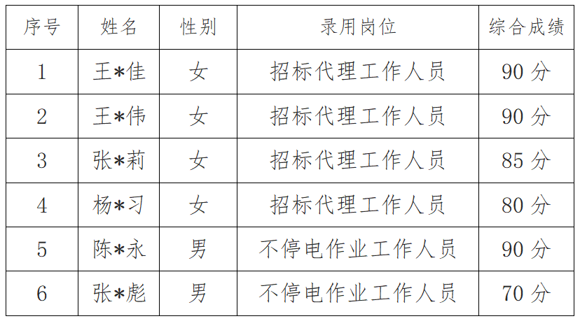 根據(jù)《安徽皖信人力資源管理有限公司宿州分公司招聘公告》的規(guī)定,經(jīng)報(bào)名、筆試,實(shí)操、體檢等流程選拔,現(xiàn)將擬錄用公告如下: