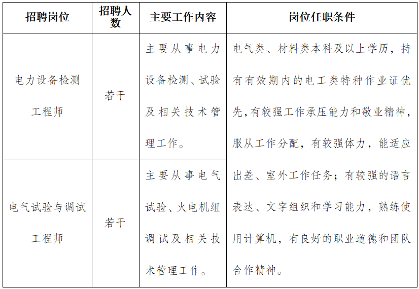 根據(jù)業(yè)務(wù)發(fā)展需要,安徽皖信人力資源管理有限公司(以下簡(jiǎn)稱“公司”)2025年擬招聘電力設(shè)備檢測(cè)、電氣試驗(yàn)、調(diào)試工程師若干名,派駐某電力央企工作。現(xiàn)將有關(guān)事項(xiàng)公告如下。