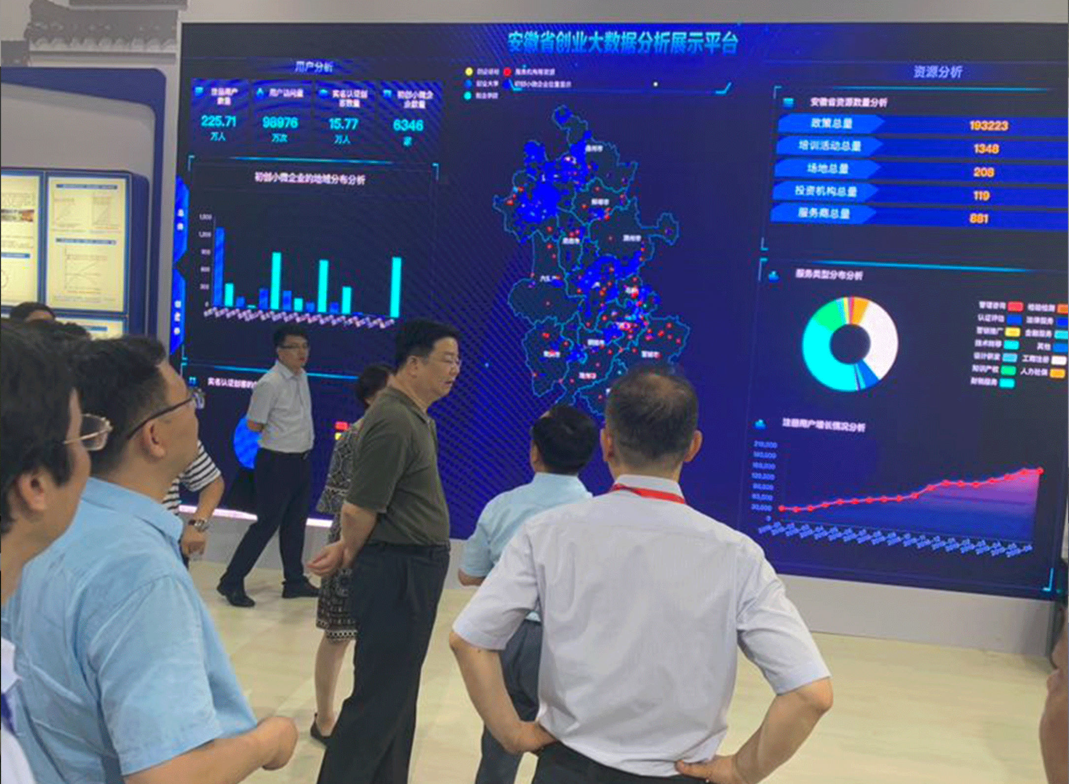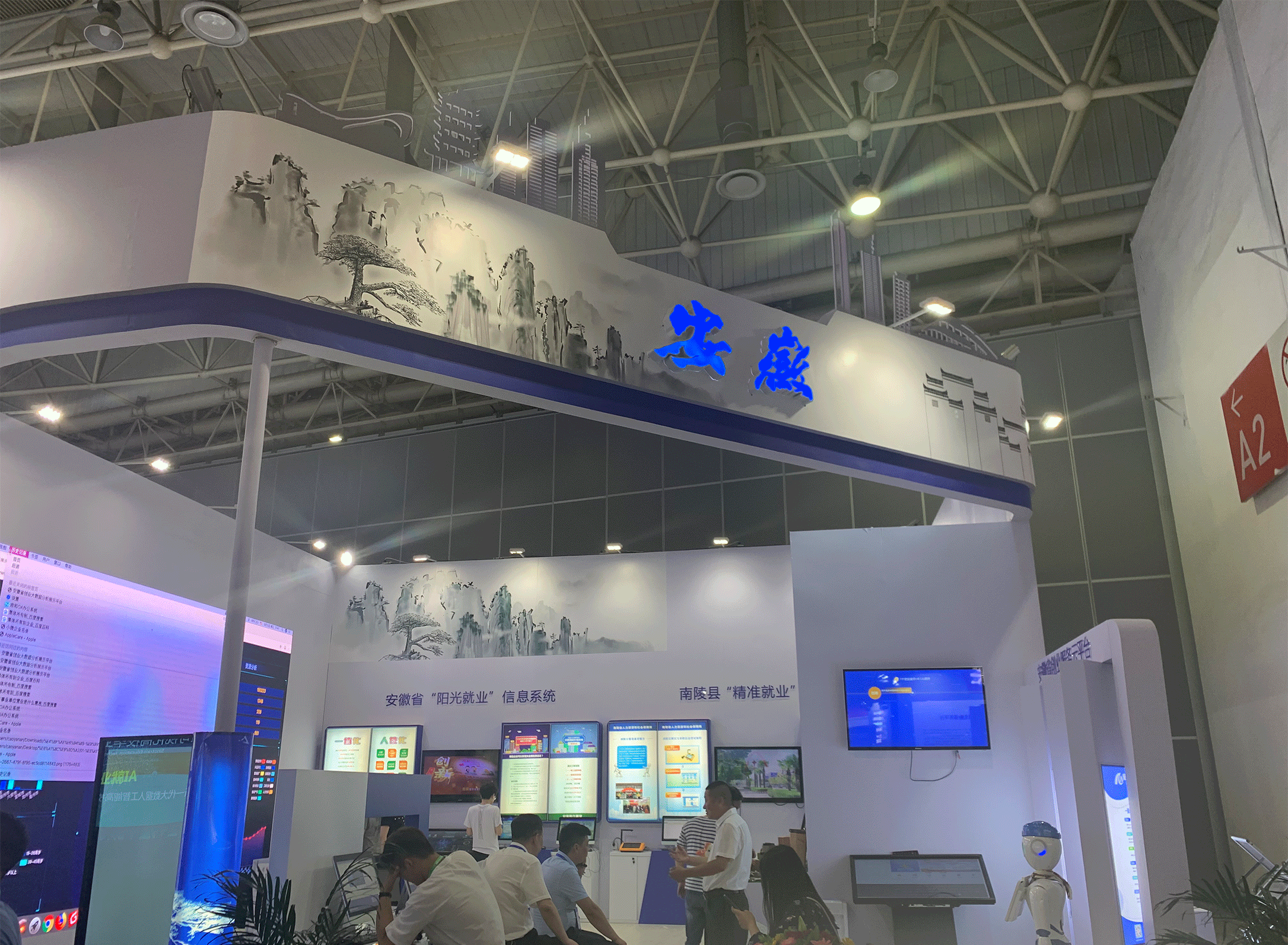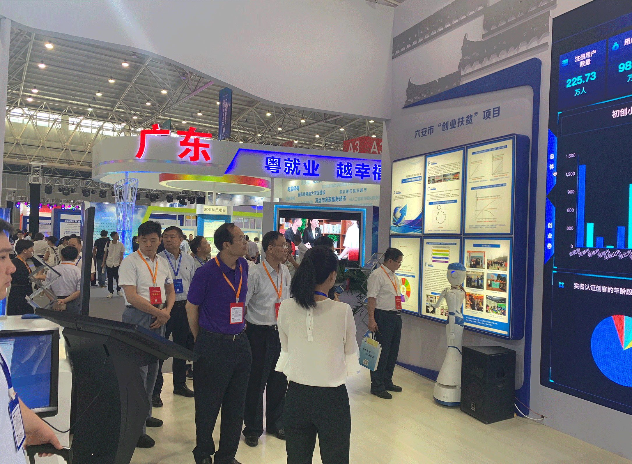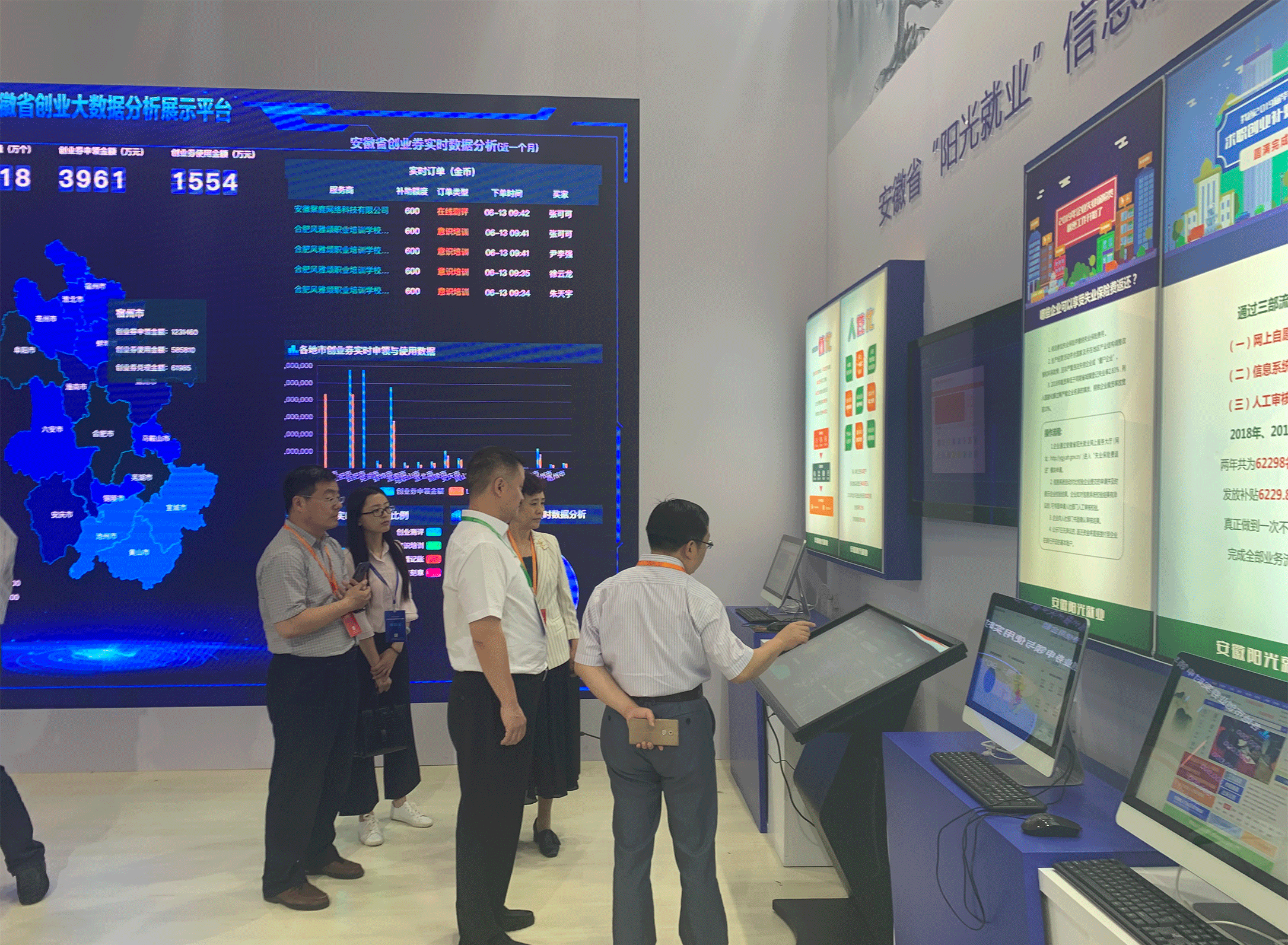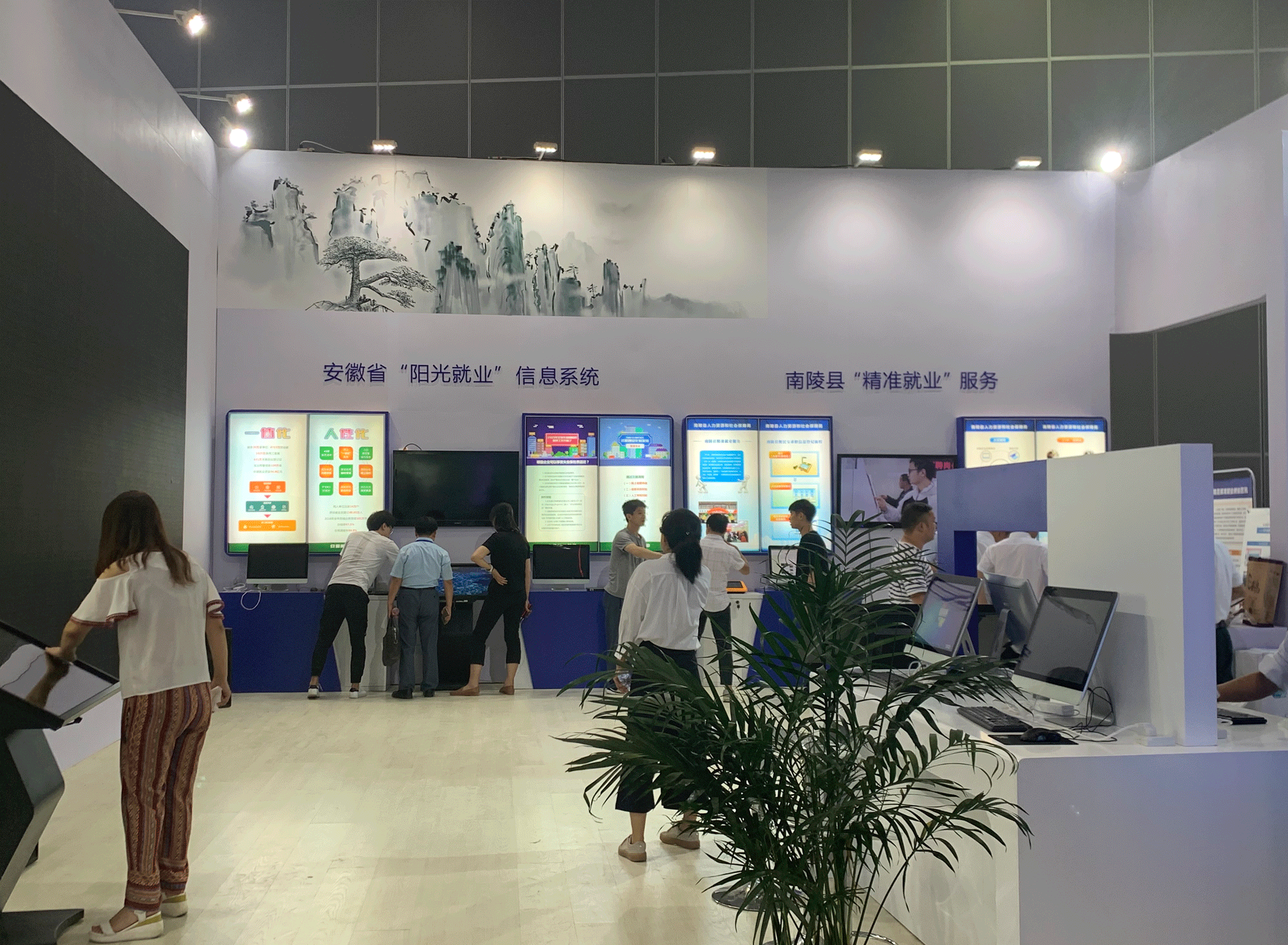 在安徽展區(qū),分別由安徽省“陽光就業(yè)”信息系統(tǒng)、南陵縣“精準(zhǔn)就業(yè)”服務(wù)、六安市“創(chuàng)業(yè)扶貧”項目、安徽省創(chuàng)業(yè)大數(shù)據(jù)分析展示平臺、安徽省創(chuàng)業(yè)服務(wù)云平臺5個項目展示區(qū)域組成。